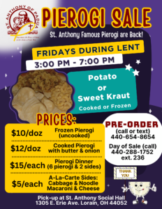 - Lent Pierogi Sale – Every Friday during Lent from 3–6 pm.