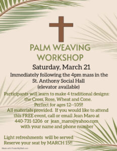 - Palm Weaving Workshop – Join us for this FREE event on Saturday, March 21st after the 4 pm. See the flyer below for details.