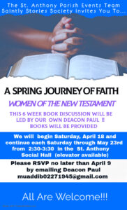 - Saintly Stories Society – Join us for this Spring Journey Through Faith: Women of the New Testament Book Club. It will be held Saturdays from 2:30-3:30 pm from April 18th until May 22nd. Please RSVP to Deacon Paul by April 9th!